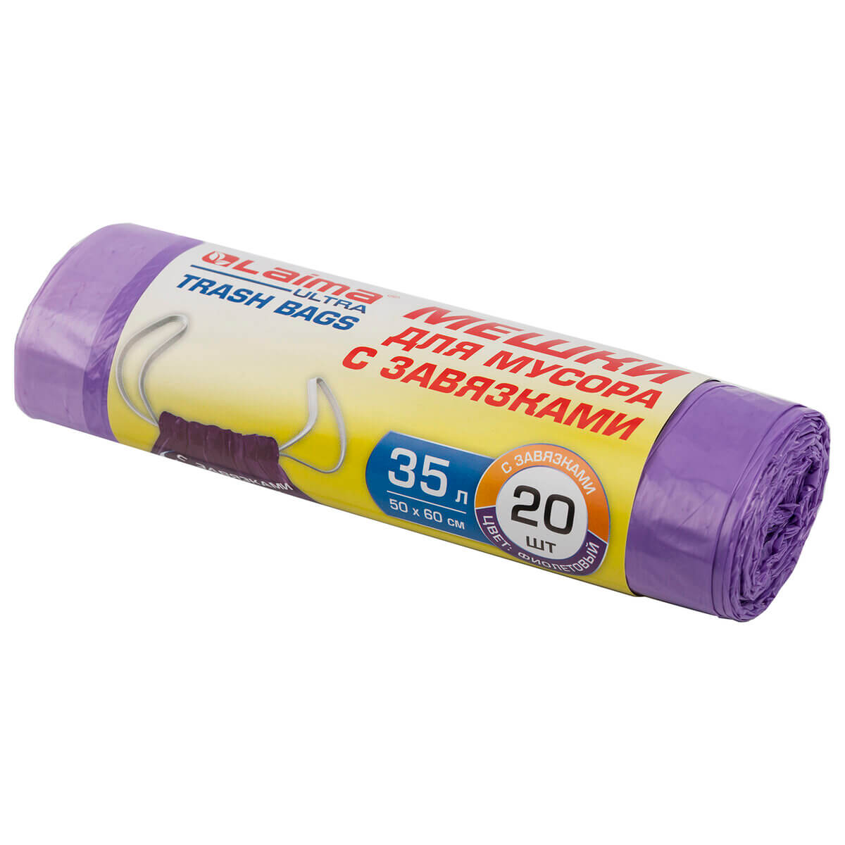 Мешки для мусора 35 л, с завязками, фиолетовые, в рулоне 20 шт., ПНД, 13 мкм, 600х500 мм, LAIMA ULTRA, 607685 в Саранске