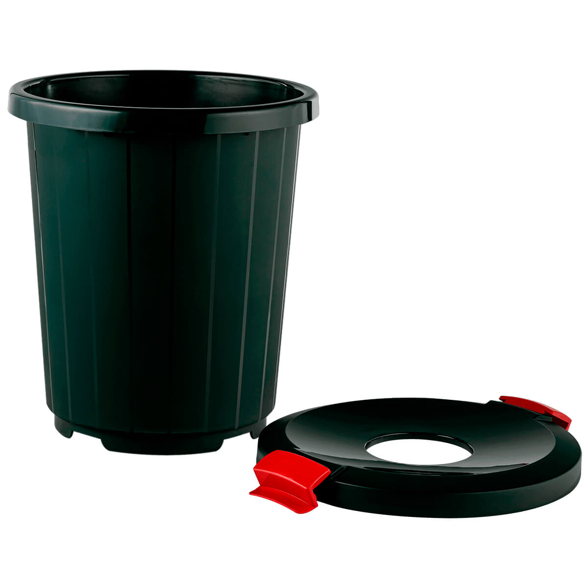 Сделайте процесс управления отходами приятным и эстетичным, выбрав наш мусорный бак с крышкой-воронкой на колесах в темно-зеленом цвете.